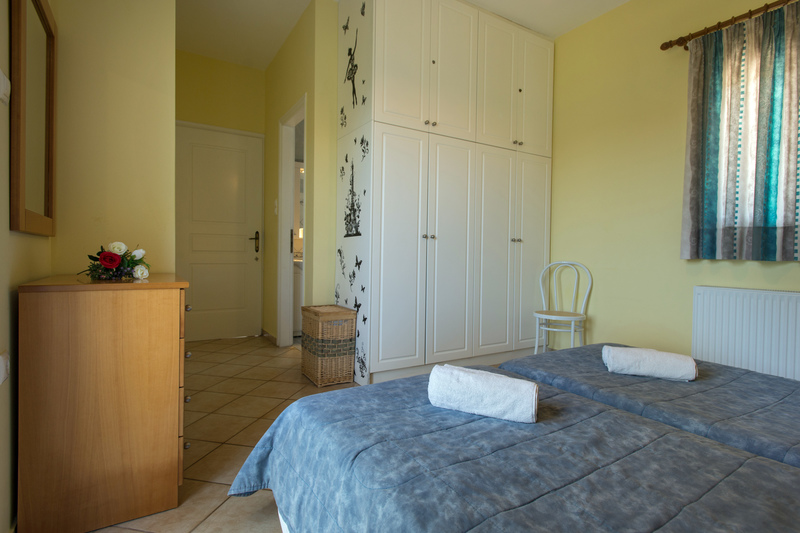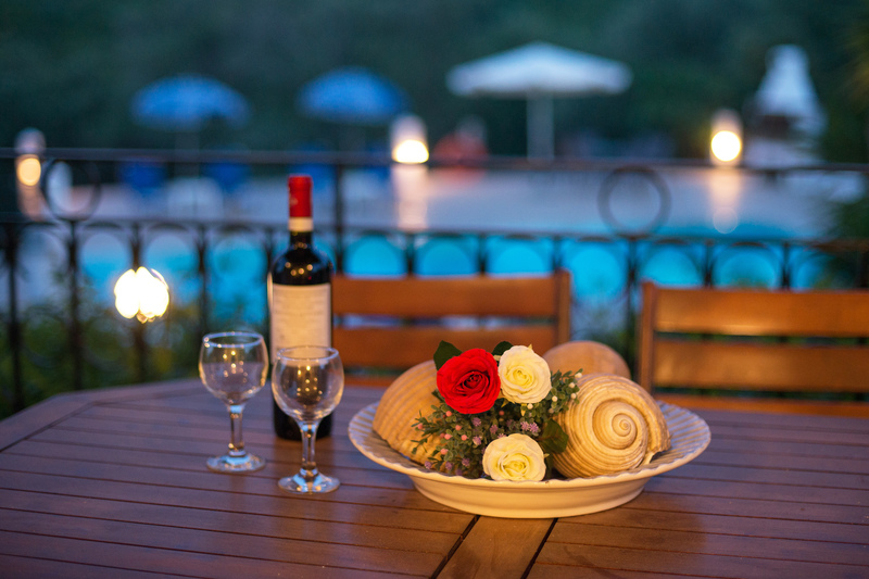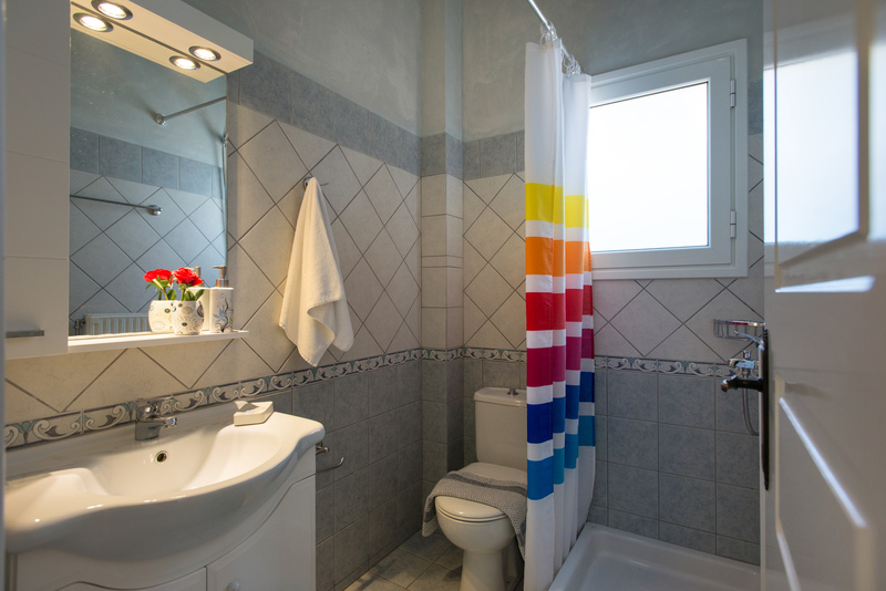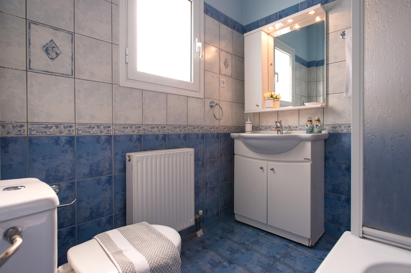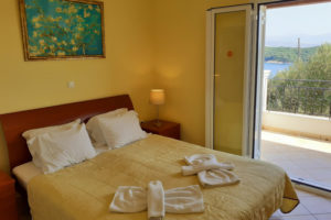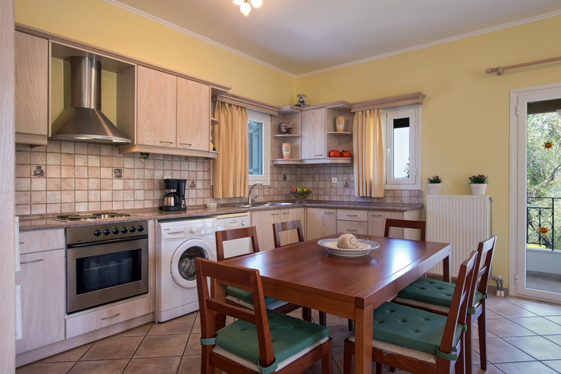 The living/dining area with french doors leading out on to a shaded terrace where you can enjoy breakfast, coffee, lunch and drink overlooking the pool and the view to Avlaki beach. The large patio surrounding the swimming pool,offers roses, privacy and relaxation. In the corner of the patio is the barbecue ideal for dining around the pool and enjoying the views.